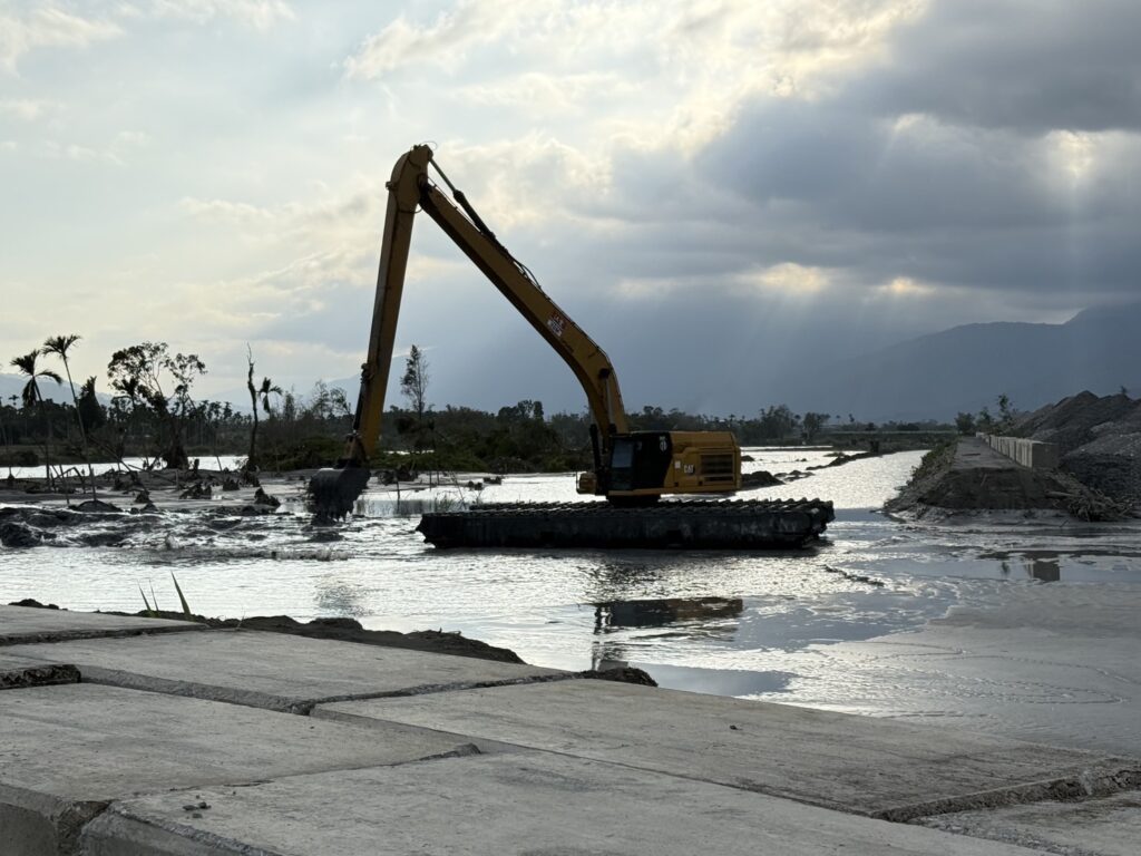 圖說:為避免馬太鞍溪堰塞湖潰壩後的泥砂持續向下游推移,水利署第九河川分署調派特殊重型機具進場清淤。