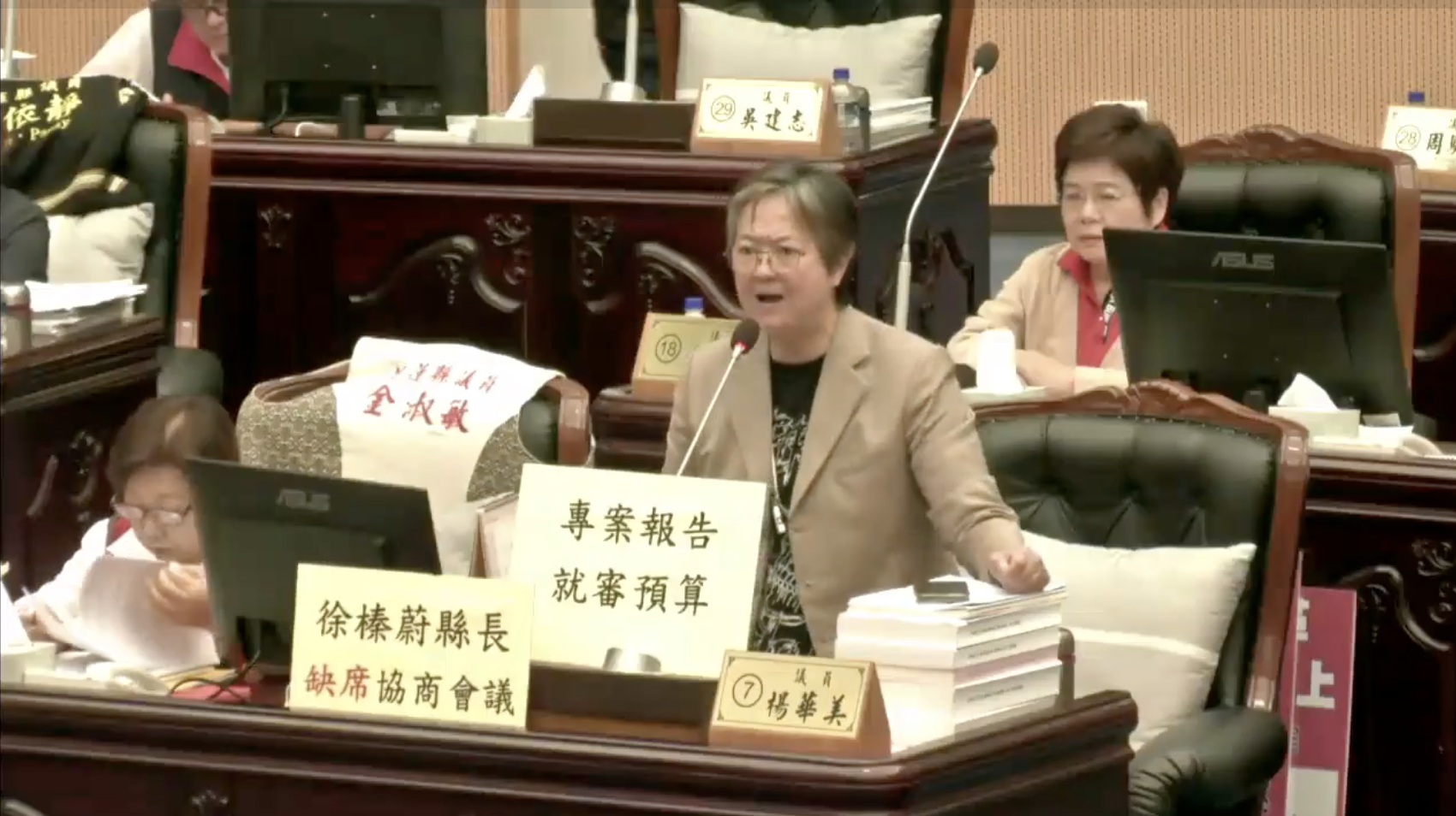 圖說:無黨籍議員楊華美對於內政部進行總預算協商後,縣府竟然發布新聞稿指控議會程序委員會遲遲不排定預算審查屬「公然違法」,表達強烈不滿。